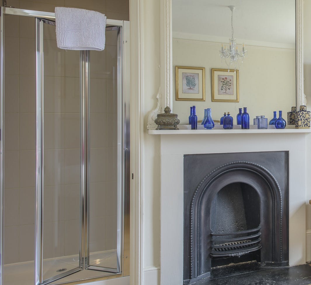 It has a small en suite step-in shower with a door and a separate small room with toilet and hand basin, both either side of the original fireplace (as a result the price of this room is at a discount).
