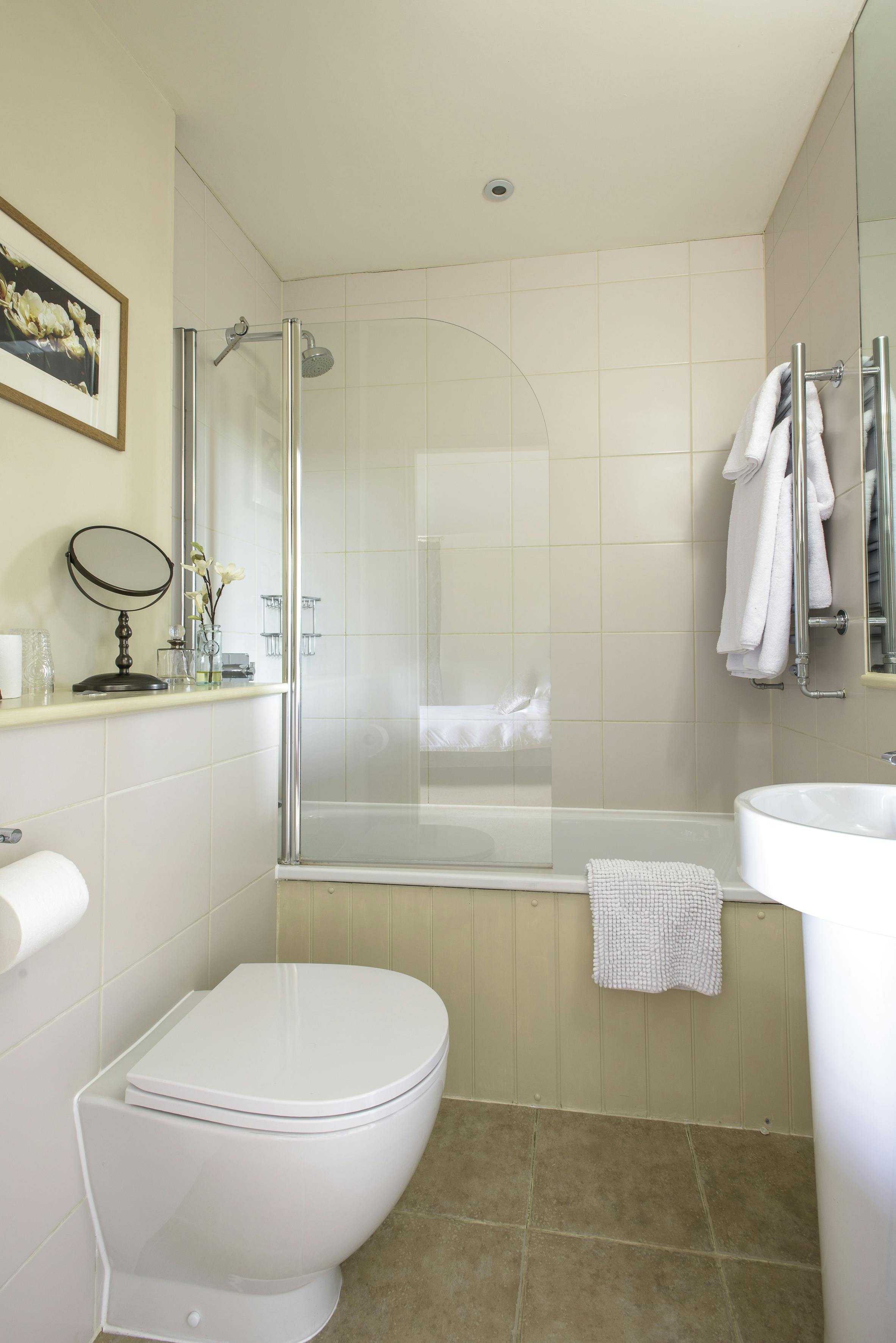 The en suite bathroom has an overhead deluge shower fitting over the bath.